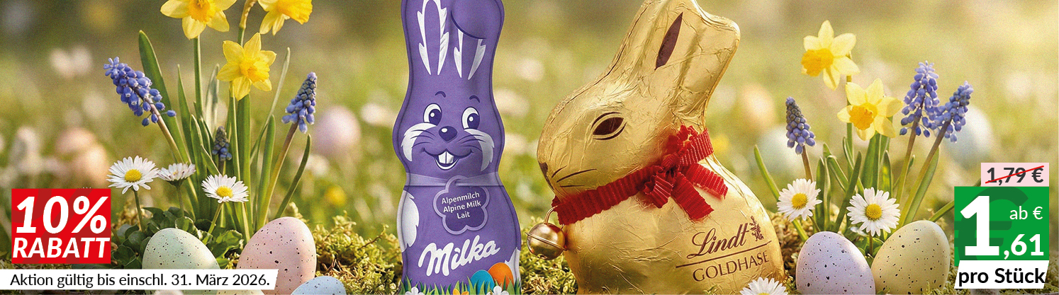 Sichern Sie sich jetzt 10% Rabatt auf die beliebten Osterhasen aus Vollmilchschokolade von Lindt und Milka. Ideal zum Verschenken, Verstecken oder einfach selbst Genießen. Nur für kurze Zeit erhältlich!