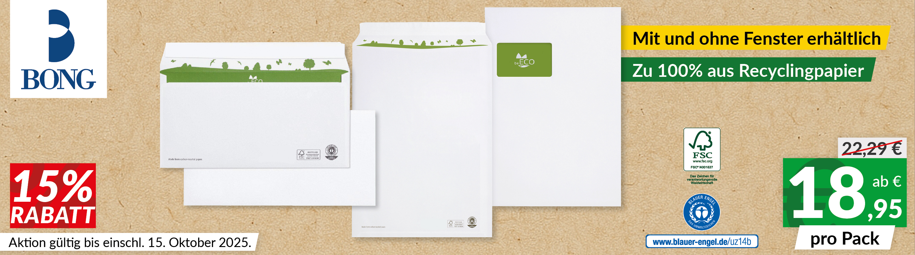 Profitieren Sie von nachhaltigem Versand und attraktiven Preisen: Beim Kauf unserer Briefumschläge und Versandtaschen aus 100 % Recyclingpapier von Bong erhalten Sie 15 % Rabatt – nur für kurze Zeit!