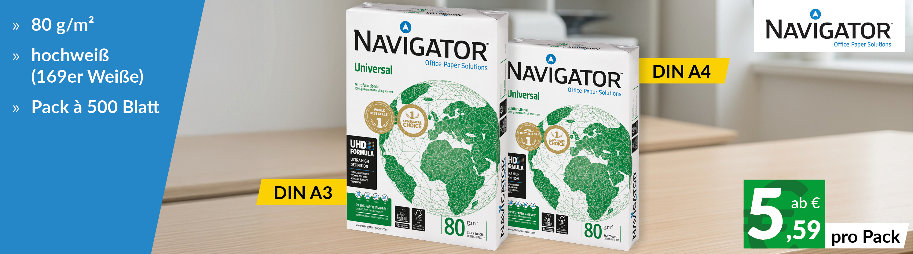 Das Navigator Universal ist das ideale Kopierpapier für höchste Ansprüche: extra glatt, besonders kontrastreich und für alle Drucker geeignet. Nachhaltig und FSC-zertifiziert – für perfekte Ergebnisse im Einklang mit der Natur. Jetzt Qualität und Nachhaltigkeit zum Sparpreis sichern!
